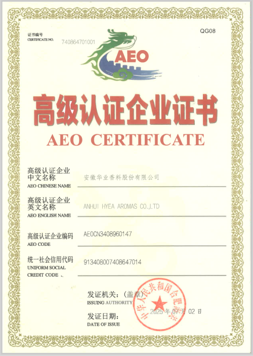 7月2日,历经十个月攻坚克难,华业香料正式获得中国海关AEO(经认证的经营者)高级认证企业证书,跻身海关信用管理最高等级企业行列。该国际贸易“VIP通行证”的获得,标志着华业香料全球供应链竞争力实现里程碑式跃升。