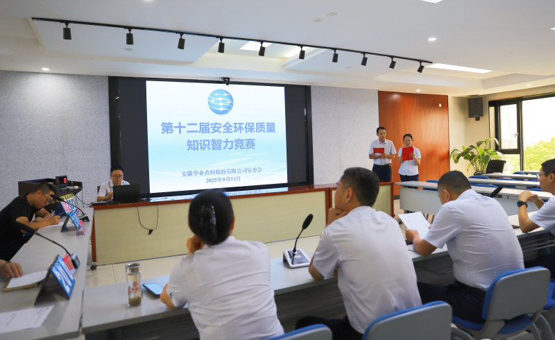 9月11日,安徽华业香料股份有限公司第十二届安全环保质量知识竞赛火热开赛。来自生产、销售、研发、行政等条线9支代表队共 27 名选手锋芒毕露,在赛场上展开智慧的较量。公司总经理徐基平率领导班子以裁判员身份出席活动,为竞赛保驾护航。