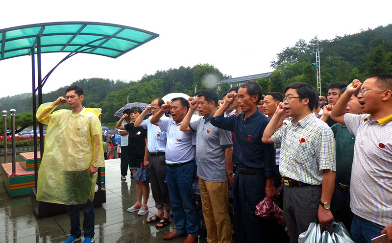 韶山是伟大领袖毛泽东的故乡,是全国著名的革命纪念地,爱国主义教育基地。24日,经过近11个小时的长途跋涉,党员们终于到达了向往已久的韶山。第二天早晨,虽然下着大雨,但参观的人们仍然络绎不绝。我们怀着崇敬的心情,来到毛主席铜像广场,在高大巍峨的铜像前,全体党员虔诚地肃立、默哀、鞠躬、并敬献了花篮,缅怀一代伟人的丰功伟绩。随后,全体党员举起右手,重温入党誓词。