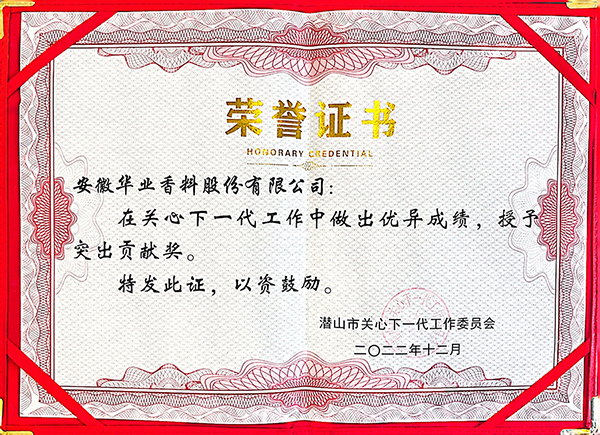 去年12月,在纪念潜山市关工委成立30周年大会上,安徽华业香料股份有限公司被授予全市“关心下一代工作突出贡献奖”。
