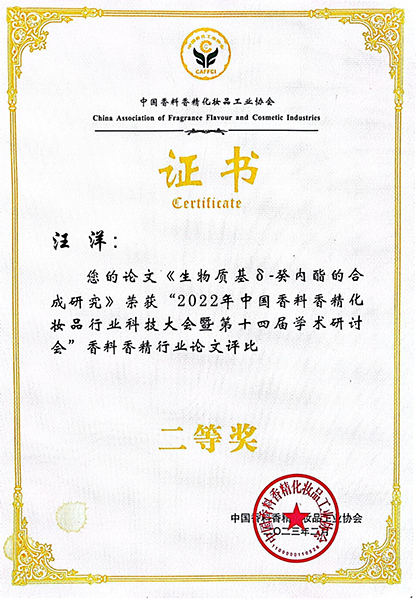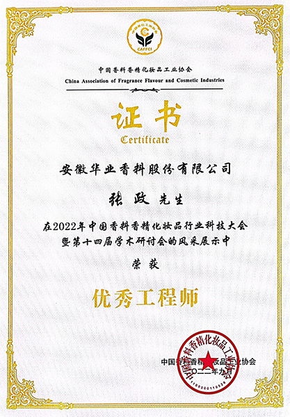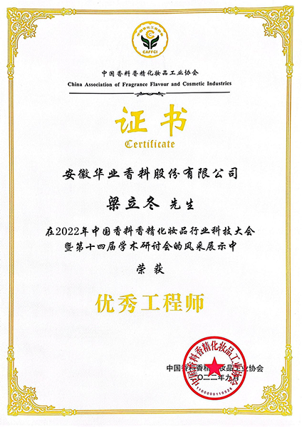 在大会上,安徽华业香料股份有限公司王天义、汪洋的论文在香料香精论文评比中荣获二等奖;梁立冬、张政荣获优秀工程师称号。