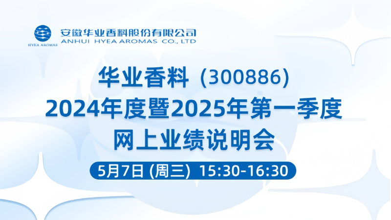 5月7日,华业香料披露公告,同时接待线上参与华业香料(300886)2024年度暨2025年第一季度网上业绩说明会的全体投资者。 公告显示,华业香料参与本次接待的人员共4人,为董事长华文亮,独立董事姚王信,财务总监徐霞云,董事会秘书、副总经理陈亮。活动地点为价值在线(https://www.ir-online.cn/)网络互动平台。